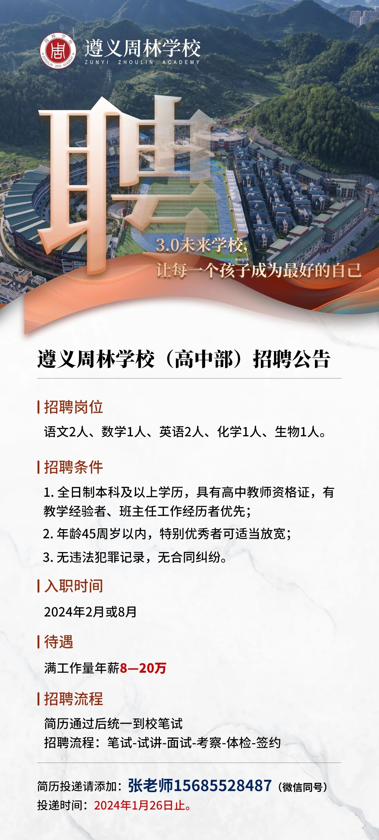 遵义周林学校(高中部)2024年教师招聘公告(7名|报名截止1月26日)
