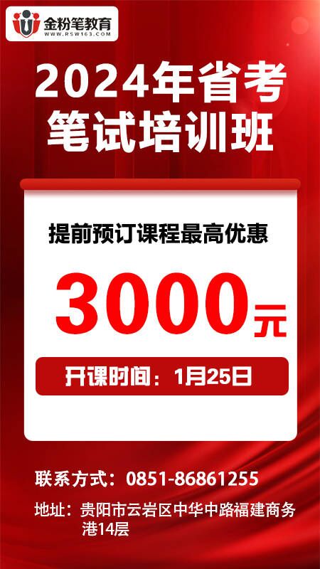 2024年贵州省考招录6142人公告公布,报名时间1月22日-1月26日。贵州金粉笔教育针对2024年贵州省考笔试开设了笔试系统强化班,1月25日开课,全面强化学习,从1月25日至2月5日,对行测和申论知识点进行强化提升学习,在开课前报班,最高可享3000元优惠,省考课程预定及详情咨询:13368515037(微同)。