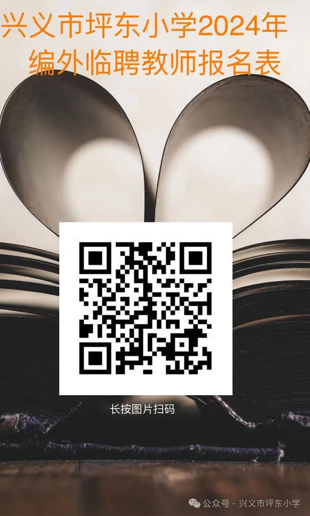 1.应聘者用微信扫一扫,扫码填写《兴义市坪东小学2024年编外教师报名表》,并上传相应资料。(应聘报名表二维码附后)