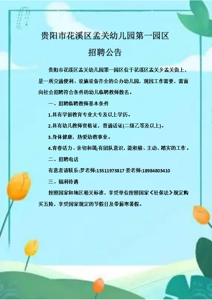 贵阳市花溪区孟关幼儿园第一园区位于花溪区孟关乡孟关街上,是一所交通便利、设施设备齐全的公办幼儿园,现因工作需要,需面向社会招聘符合条件的幼儿临聘教师数名。