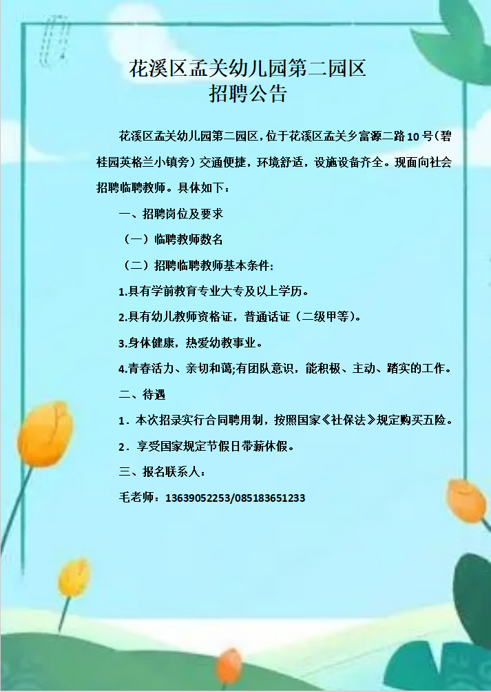 花溪区孟关幼儿园第二园区,位于花溪区孟关乡富源二路10号(碧桂园英格兰小镇旁)交通便捷,环境舒适,设施设备齐全。现面向社会招聘临聘教师。具体如下: