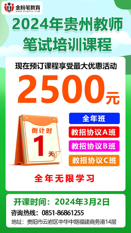 贵州金粉笔教育2024年贵州教招笔试培训课程第六轮优惠2500元截止时间2月29日24:00,教师笔试培训班优惠倒计时1天。