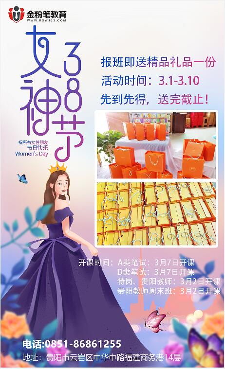 贵州金粉笔教育2024年特岗教师笔试培训班3月2日开课,为了庆祝3.8妇女节,在3月1日-3月10日期间,报班即送精美礼品一份,先到先得,送完为止。报班订课咨询:13368515037(微同)。