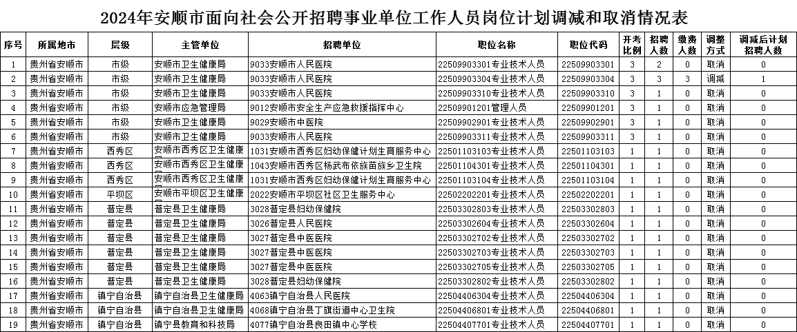 2024年安顺市面向公开招聘事业单位人员报名缴费已结束,根据《2024年安顺市面向社会公开招聘事业单位工作人员公告》(以下简称《招聘公告》)规定,现对报名缴费人数与计划招聘人数之比达不到3:1比例的岗位调整和取消情况公告如下: