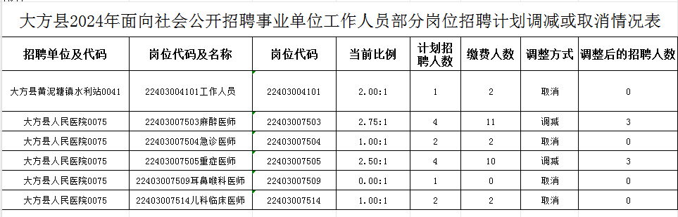 大方县2024年面向社会公开招聘事业单位工作人员报名工作已结束。根据《大方县2024年面向社会公开招聘事业单位工作人员简章》(以下简称《简章》)“网上缴费结束后,岗位缴费人数与招聘计划数达不到3:1比例的岗位,该岗位招聘计划予以减少或取消。岗位招聘计划减少或取消的情况在大方县人民政府网官网上公布。岗位招聘计划减少的,报考该岗位的考生所报岗位不再进行调整;岗位招聘计划取消的,办理退费手续”的规定,现将有关单位招聘计划岗位减少或取消的情况进行公告,具体详见附件。