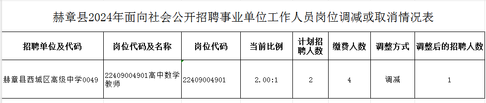 赫章县2024年面向社会公开招聘事业单位工作人员报名工作已结束。根据《赫章县2024年面向社会公开招聘事业单位工作人员简章》(以下简称《简章》)“网上缴费结束后,岗位缴费人数与招聘计划数达不到3:1比例的岗位,该岗位招聘计划予以减少或取消。岗位招聘计划减少或取消的情况在赫章县人民政府网或毕节市人力资源和社会保障局官网上公布。岗位招聘计划减少的,报考该岗位的考生所报岗位不再进行调整;岗位招聘计划取消的,办理退费手续”的规定,现将有关单位招聘计划岗位减少或取消的情况进行公告,具体详见附件。