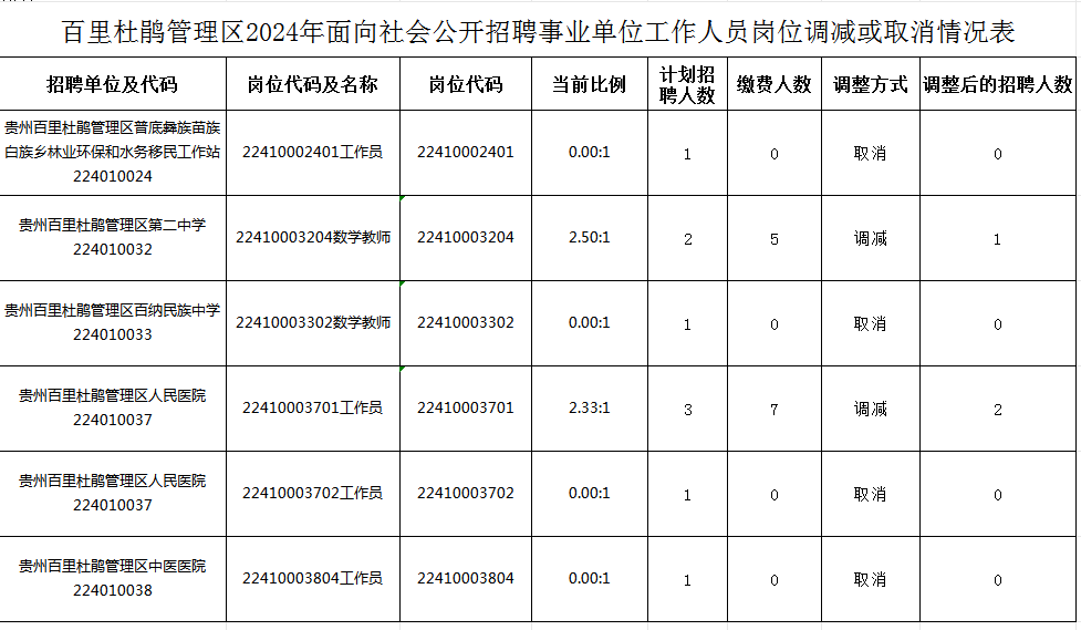 百里杜鹃管理区2024年面向社会公开招聘事业单位工作人员报名工作已结束。根据《百里杜鹃管理区2024年面向社会公开招聘事业单位工作人员简章》的规定,“网上缴费结束后,岗位缴费人数与招聘计划数达不到3:1比例的岗位,该岗位招聘计划予以减少或取消。岗位招聘计划减少或取消的情况在毕节市人民政府网或毕节市人力资源和社会保障局或百里杜鹃管理区管理委员会官网上公布。岗位招聘计划减少的,报考该岗位的考生所报岗位不再进行调整;岗位招聘计划取消的,办理退费手续”。现将有关单位招聘计划岗位减少或取消的情况进行公告,具体详见附件。