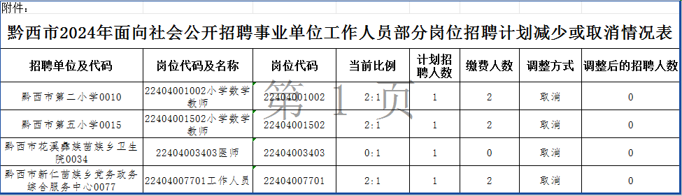 黔西市2024年面向社会公开招聘工作人员报名工作已结束。根据《黔西市2024年面向社会公开招聘工作人员简章》(以下简称《简章》)“网上缴费结束后,岗位缴费人数与招聘计划数达不到3:1比例的岗位,该岗位招聘计划予以减少或取消〔报考医师岗位(中医临床、西医临床、公共卫生管理岗位)的除外〕。岗位招聘计划减少或取消的情况在黔西市人民政府网上公布。岗位招聘计划减少的,报考该岗位的考生所报岗位不再进行调整;岗位招聘计划取消的,办理退费手续”的规定,现将有关单位招聘计划岗位减少或取消的情况进行公告,具体详见附件。