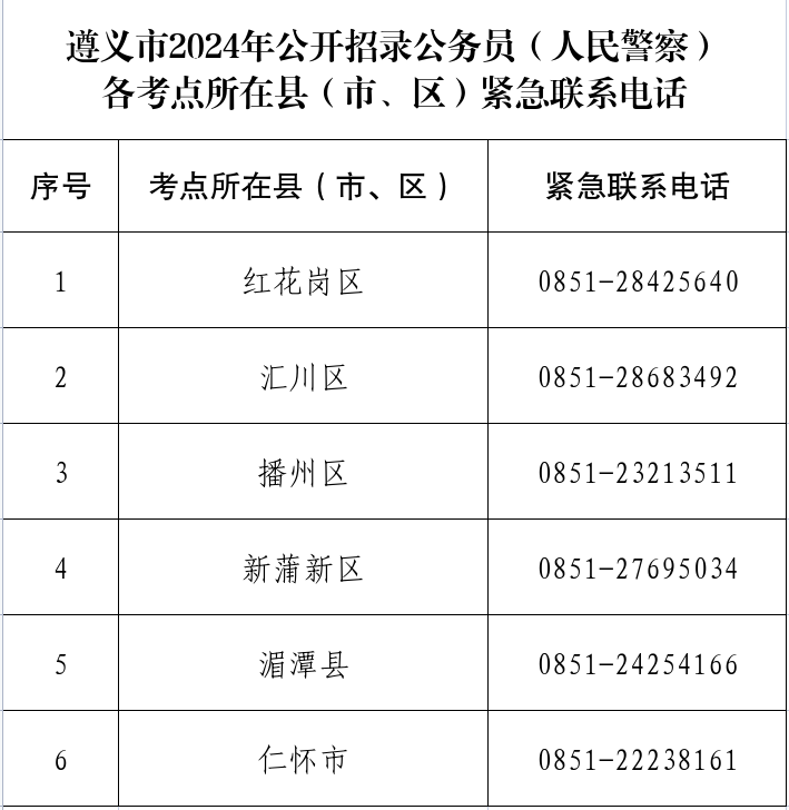 附件二:遵义市2024年公开招录公务员(人民警察)各考点所在县(市、区)紧急联系电话