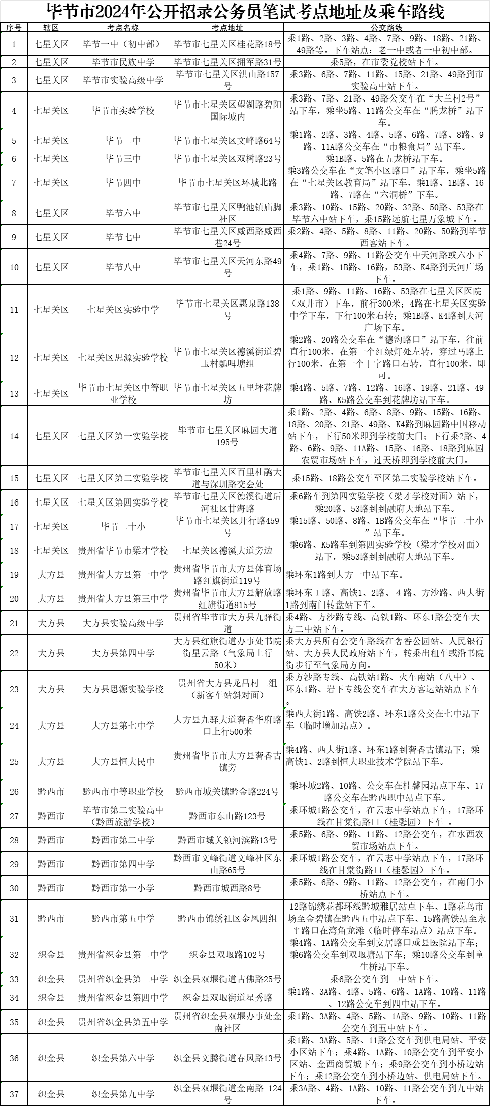 附件:毕节市2024年公开招录公务员笔试考点地址及乘车路线