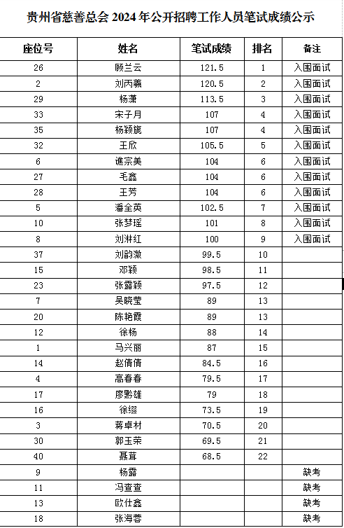 根据《贵州省慈善总会公开招聘工作人员笔试面试工作方案》,目前,已完成笔试环节工作,现对拟进入面试人员名单进行公示,并将有关工作安排通知如下: