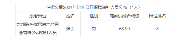 住投公司2024年对外公开招聘贵州黔盛优居房地产置业有限公司财务人员岗位综合成绩排名第1名的万壮丽同志因个人原因主动放弃此次录用,根据方案要求,当出现弃权或其他原因不能聘用时,按照该岗位综合成绩排名顺延进行1次递补,递补至该岗位综合成绩排名第3名的张引同志进入下一环节参加政审和体检。