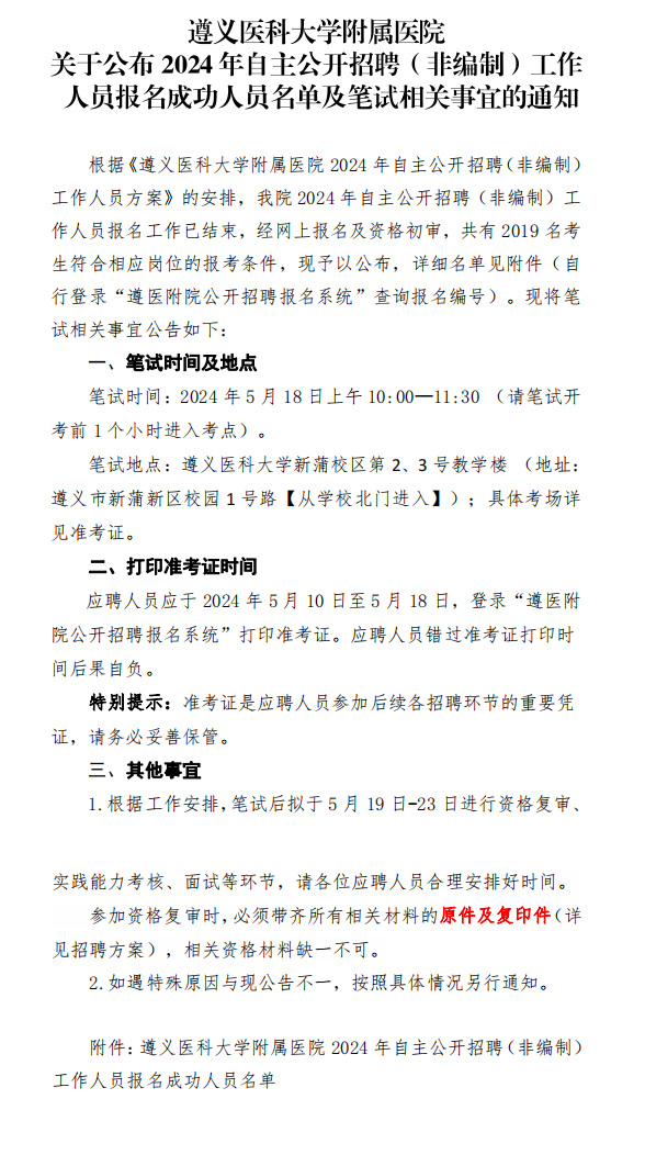遵义医科大学附属医院2024年自主招聘(非编制)工作人员报名成功人员名单及笔试通知(5.18笔试)