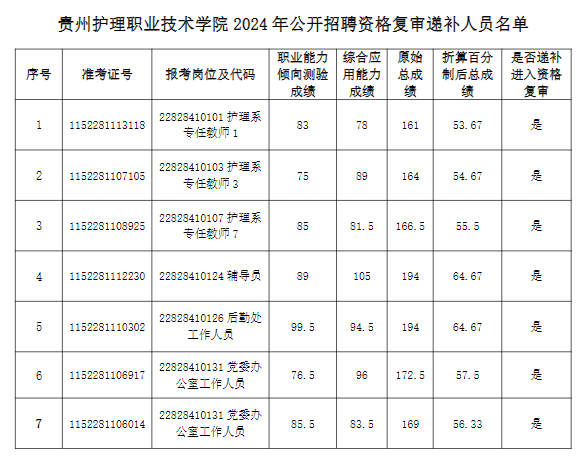 贵州护理职业技术学院于2024年5月15日进行了2024年公开招聘工作人员资格复审工作。由于部分岗位进入资格复审的考生自愿放弃或未在规定时间内参加资格复审,根据《贵州护理职业技术学院2024年公开招聘工作人员方案》,空缺人数按同岗位有效笔试成绩由高到低依次递补,现公布资格复审递补人员名单(附件),请资格复审递补人员在2024年5月17日下午5:00前到贵州省黔南州贵定县盘江镇贵州护理职业技术学院(金海校区)博文楼一楼录播教室进行资格复审。