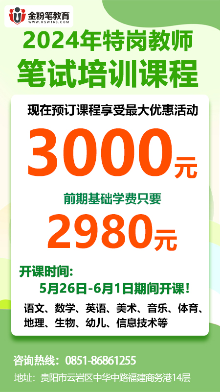 贵州特岗教师笔试培训多久?贵州特岗教师笔试培训班哪家机构好?贵州特岗教师《学科专业知识》培训班多少钱?贵州特岗笔试培训费用多少?针对2024年贵州特岗教师考试,贵州金粉笔教育2024年贵州特岗教师考试培训课程5月报班优惠来了,特岗笔试培训内容主要为《教育综合知识》+《学科专业知识》,学科专业知识分科进行培训,多种班次,培训费用和培训时长不同。从5月份起,特岗各学科笔试班陆续开课,在开课前预定课程或报班,最高可享3000元优惠。特岗培训班预定或详情咨询:13368515037(微同)