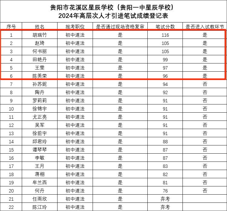 根据《第十二届贵州人才博览会贵阳贵安事业单位引进高层次及急需紧缺人才工作方案》、《花溪区事业单位2024年引进高层次人才工作实施方案》、《贵阳市花溪区星辰学校(贵阳一中星辰学校)2024年度引进高层次人才初评方案》要求,贵阳一中星辰学校初评笔试成绩公布如下: