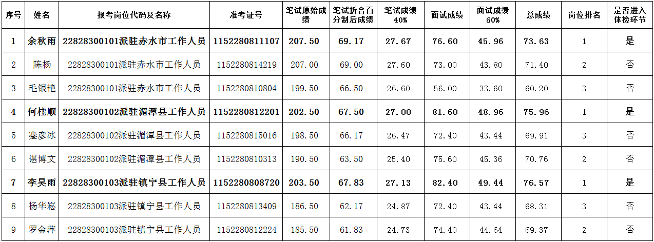 贵州省农村住户调查监测中心2024年公开招聘面试工作已结束,根据《贵州省农村住户调查监测中心2024年公开招聘工作人员方案》的有关规定,现对考生面试成绩及总成绩和体检相关事宜予以公告。
