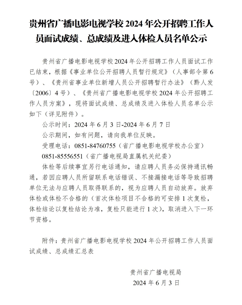 2024年贵州省广播电影电视学校招聘面试成绩、总成绩及进入体检人员名单公示