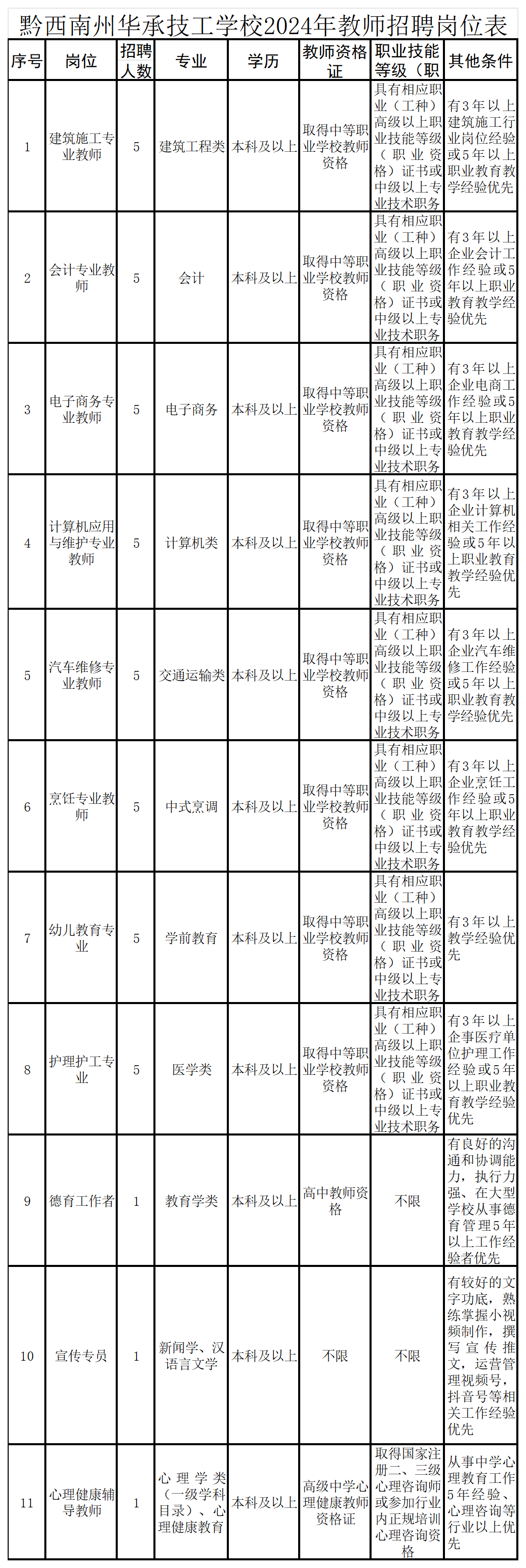 学校现有在校生3000余人,是目前黔西南州技工院校中办学规模最大的学校。根据学校发展需要,现面向社会及职业教育界招聘优秀专业教师若干人。