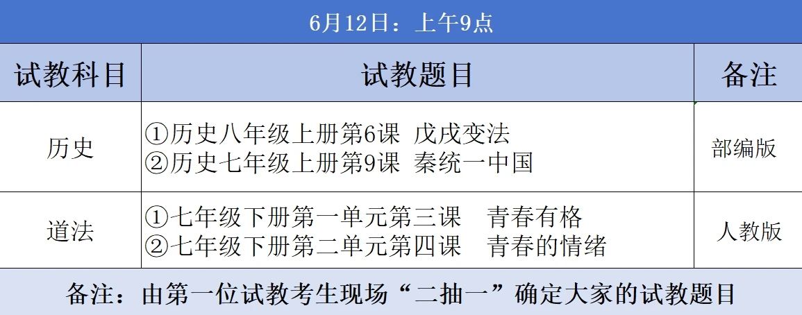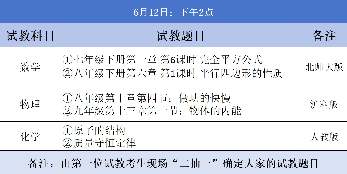 (1)本次试教每个学科有2套试教题,试教当天不提供备考时间,各学科考场试题由本学科第一位试教考生现场“二抽一”确定大家的试教题目。试教在普通教室进行,不提供教学多媒体设备。考生可自带教材、教案、教具等材料,试教时间约10分钟左右,具体以考官现场测试要求为准,不得违反考试规定,否则按违纪处理。