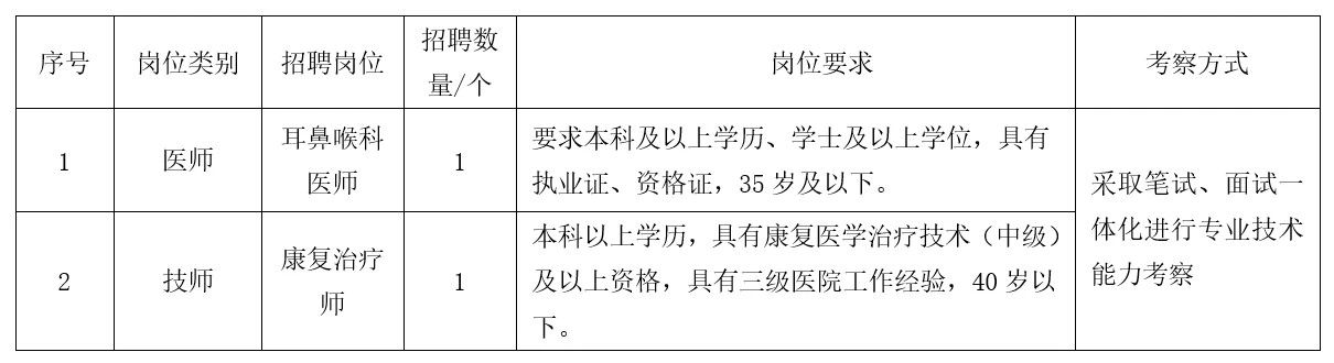为加强医院人才队伍建设,根据学科发展需要,我院面向社会公开自主招聘编外2名医务人员,现将有关事宜公布如下: