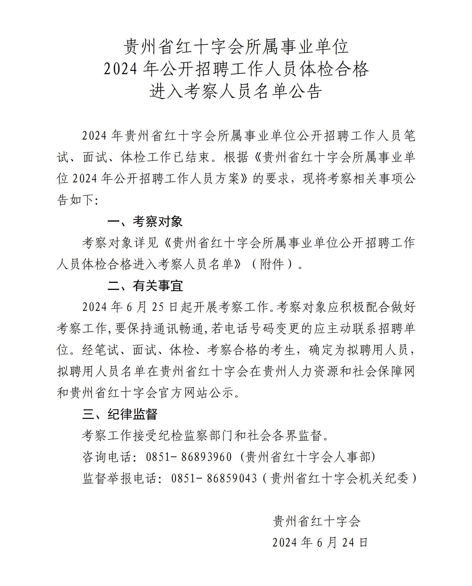 2024年贵州省红十字会所属事业单位招聘体检合格 进入考察人员名单公告