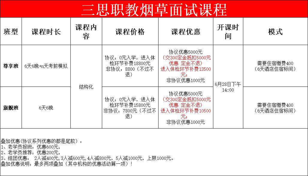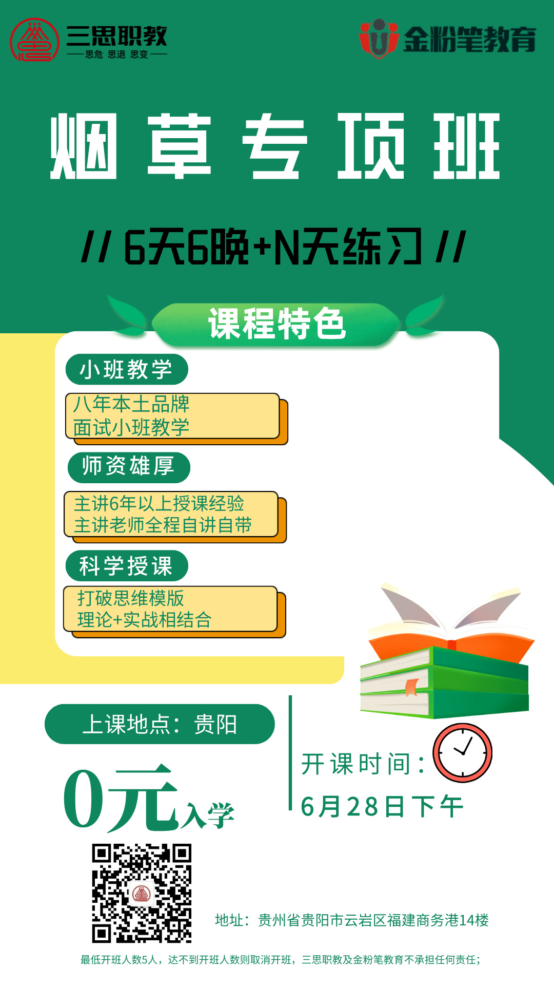 贵州三思职教2024年贵州烟草面试培训班课程开设了,本次培训课程针对烟草公司面试考试形式进行培训,结构化面试培训,适用于本次贵州烟草招考面试考试培训,有尊享班、旗舰班,课程6天6晚。烟草公司面试课程预定及咨询:13368515037(微同)。