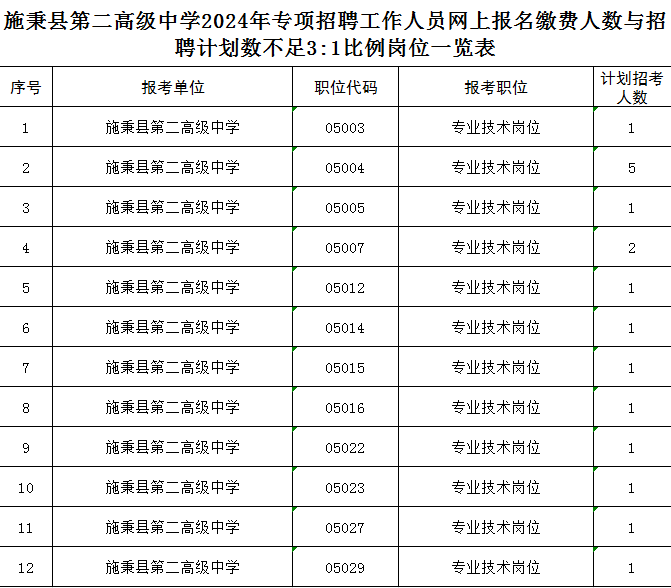 根据《施秉县第二高级中学2024年专项招聘事业单位工作人员实施方案》的有关规定,现将我县网上报名缴费人数与招聘计划数不足3:1比例岗位予以公示,供报名人员参考,统计截至时间为:2024年6月26日下午17:00。