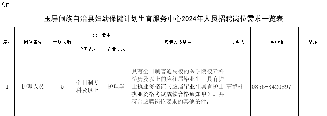 附件:1.玉屏侗族自治县妇幼保健计划生育服务中心2024年人员招聘 岗位需求一览表