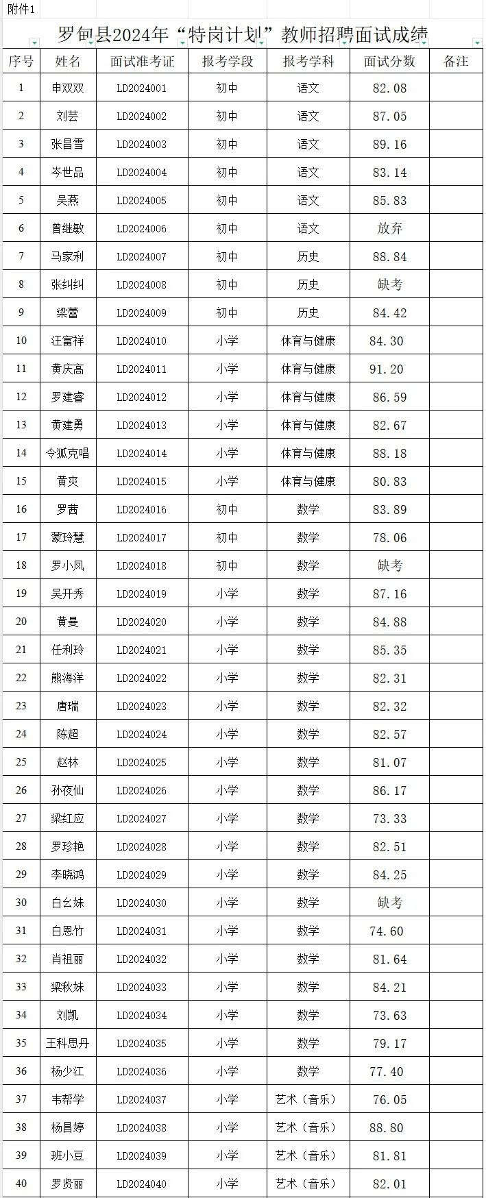 考生面试成绩详见《罗甸县2024年“特岗计划”教师招聘面试成绩》(附件1)。