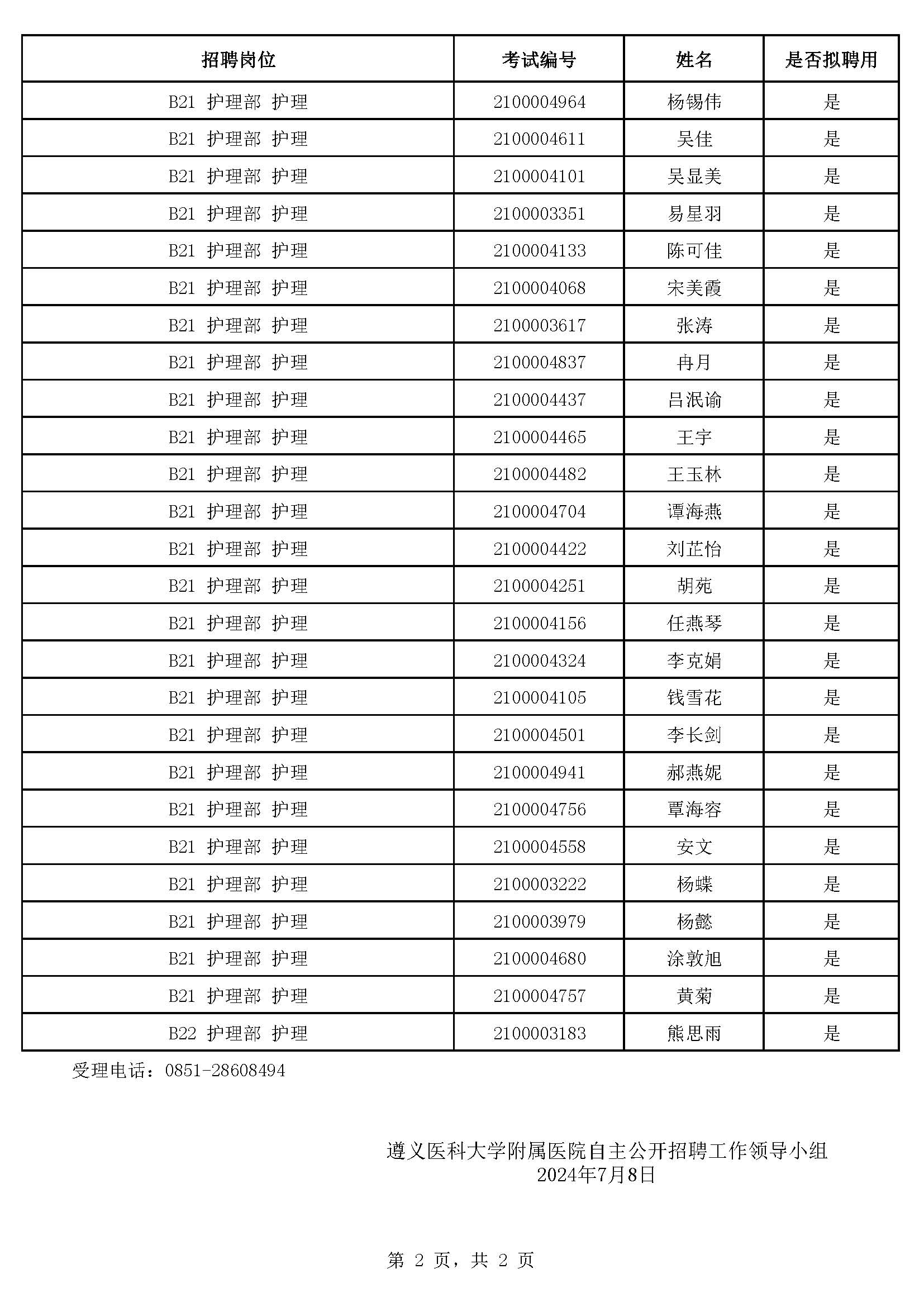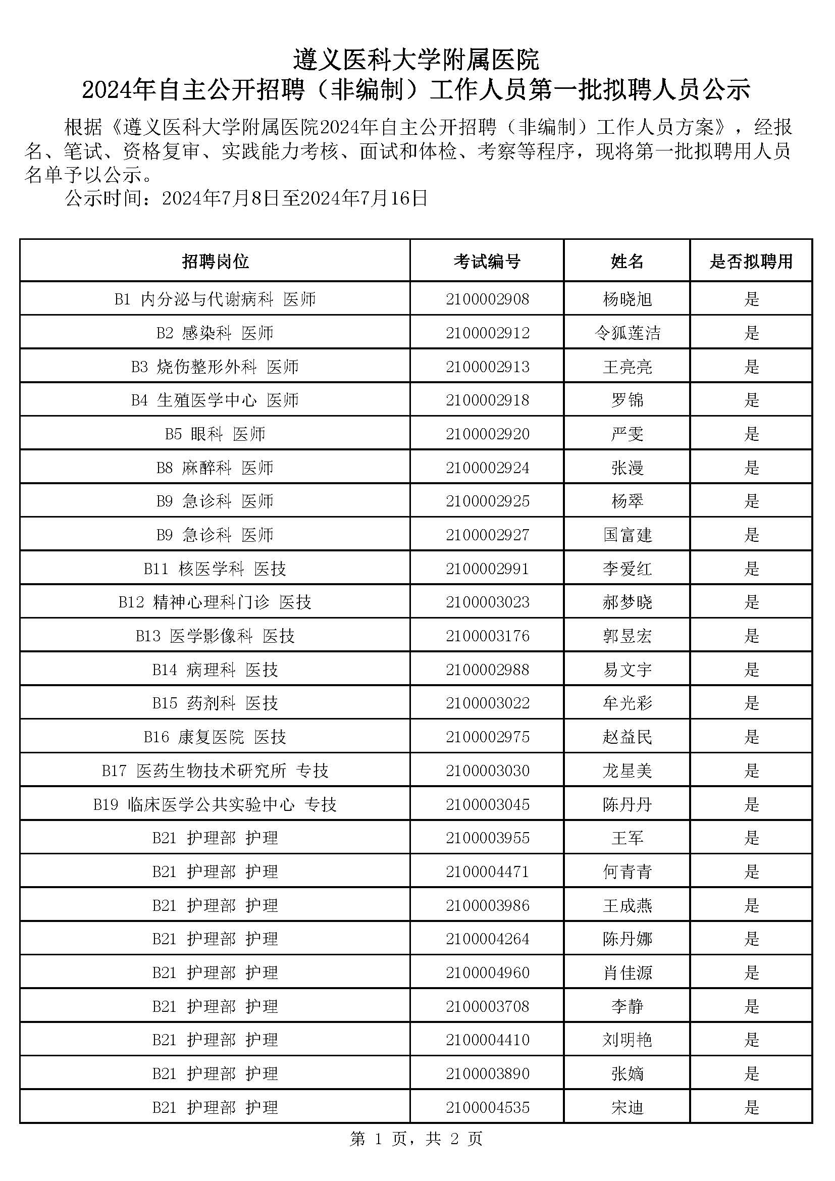 遵义医科大学附属医院2024年自主招聘(非编制)工作人员第一批拟聘人员公示