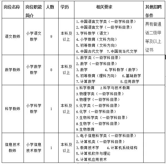 7.年龄要求在35周岁及以下(优秀教师具有本科以上学历,专业符合且能提供教学优秀业绩材料的适当放宽年龄);有较强的教育教学能力,有教学和班主任工作经验者优先。