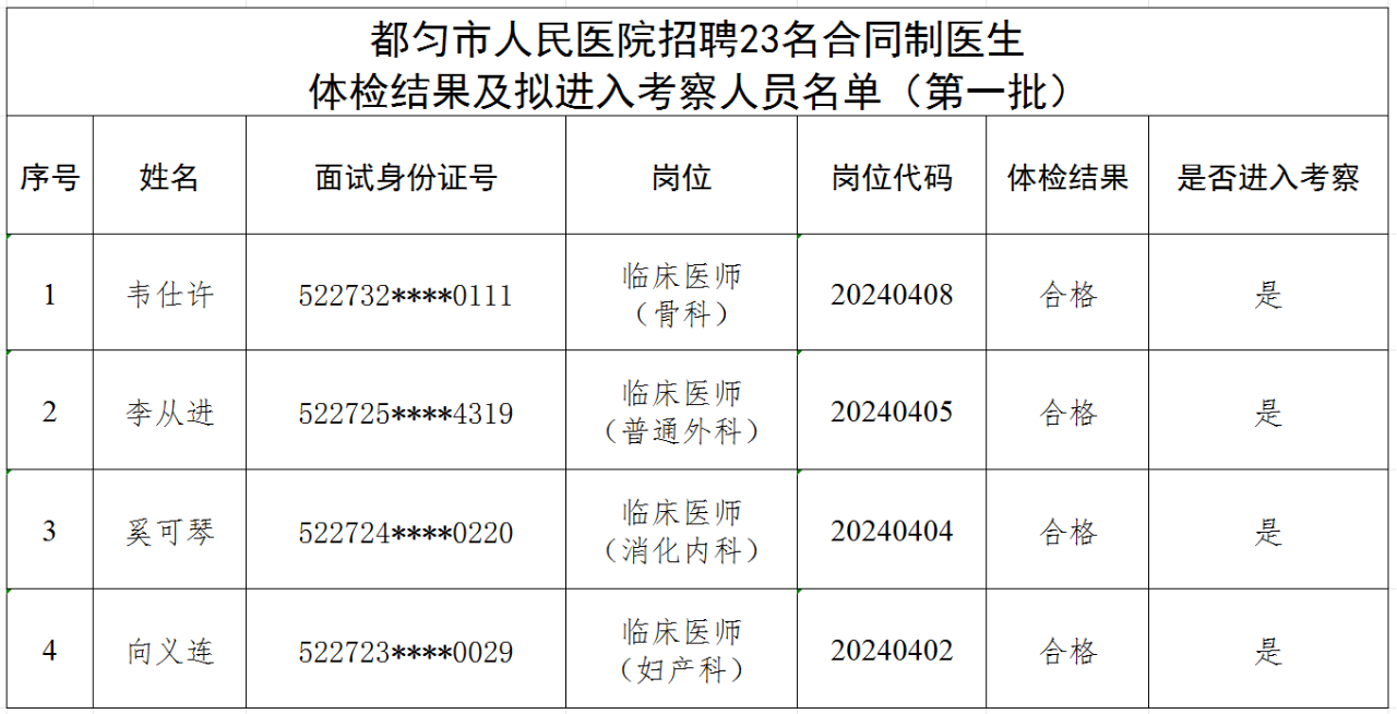 根据《都匀市人民医院招聘23名合同制医生简章》(以下简称《招聘简章》)规定,都匀市人民医院招聘23名合同制医生第一批体检工作已完成,现将体检合格人员名单及进入考察人员名单(第一批)公示如下: