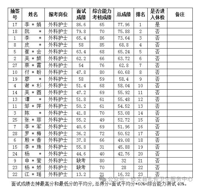 根据《修文县扎佐卫生服务中心2024年公开招聘编制外专业技术人员公告》规定,我院2024年7月公开招聘专业技术人员报名、资格审核、能力测试、面试工作已结束,现就总成绩排名及体检相关事项公告如下: