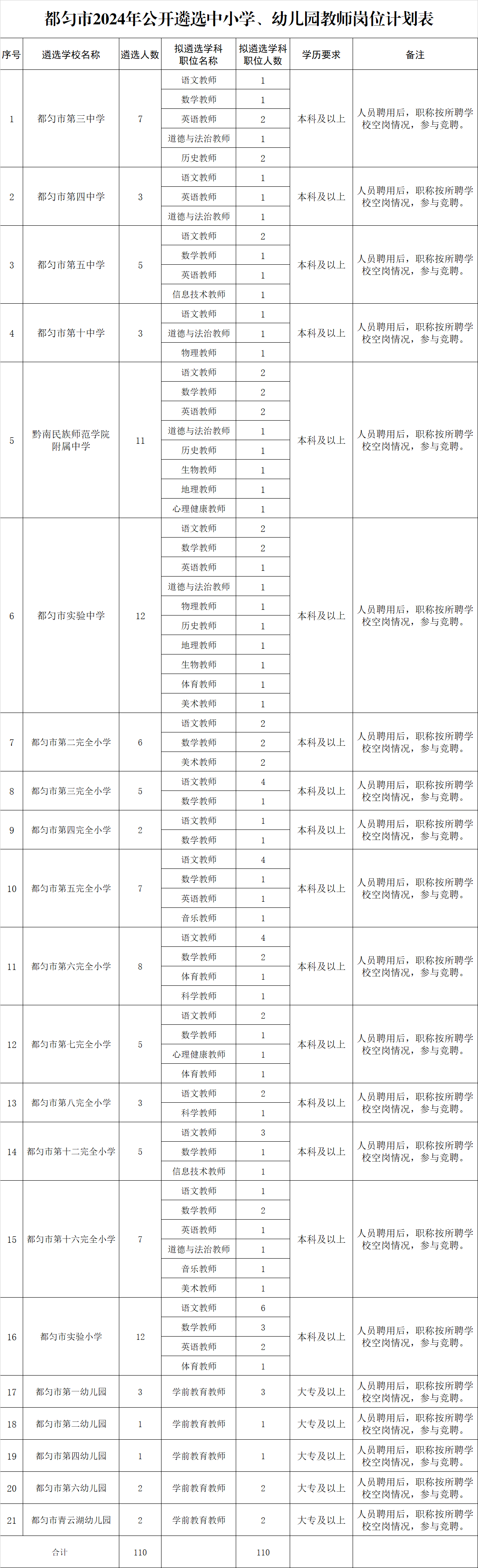 从都匀市乡镇中小学、幼儿园在编教师中遴选110人。其中:初中教师41人、小学教师60人,幼儿园教师9人,具体遴选岗位、人数及学科详见《都匀市2024年公开遴选中小学、幼儿园教师岗位计划表》(附件1)。