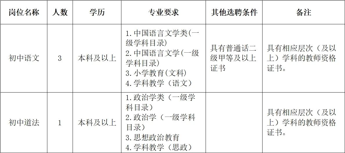 此次共招聘教师4人。初中语文3人,初中道法1人。