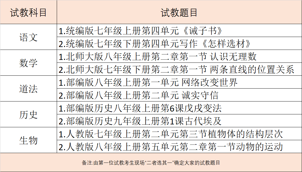 (1)本次试教每个学科有2套试教题,试教当天不提供备考时间,各学科考场试题由本学科第一位试教考生现场“二者选其一”确定大家的试教题目。试教在普通教室进行,不提供教学多媒体设备。考生可自带教材、教案、教具等材料,试教时间5-10分钟,具体以考官现场测试要求为准。