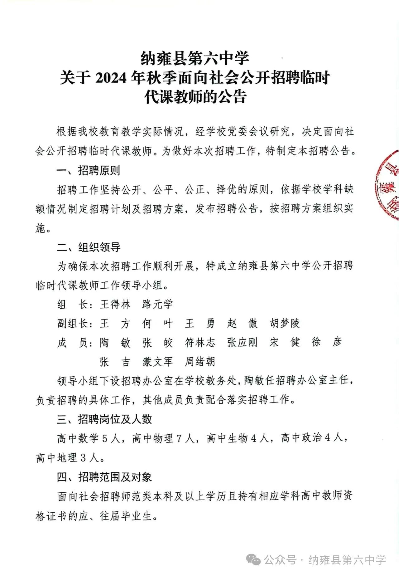纳雍县第六中学2024年秋季学期招聘临时代课教师的公告