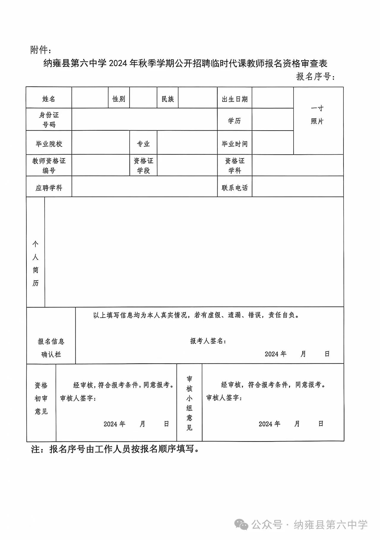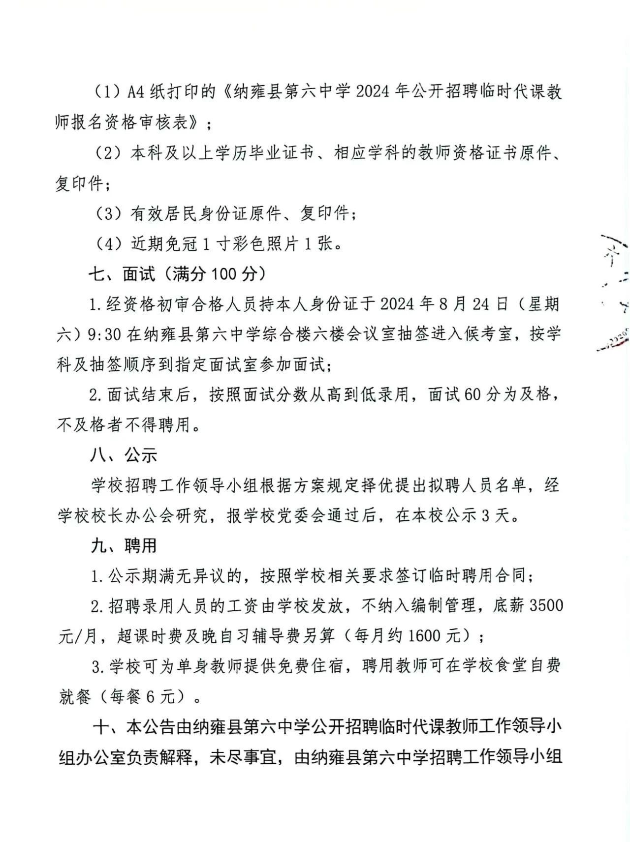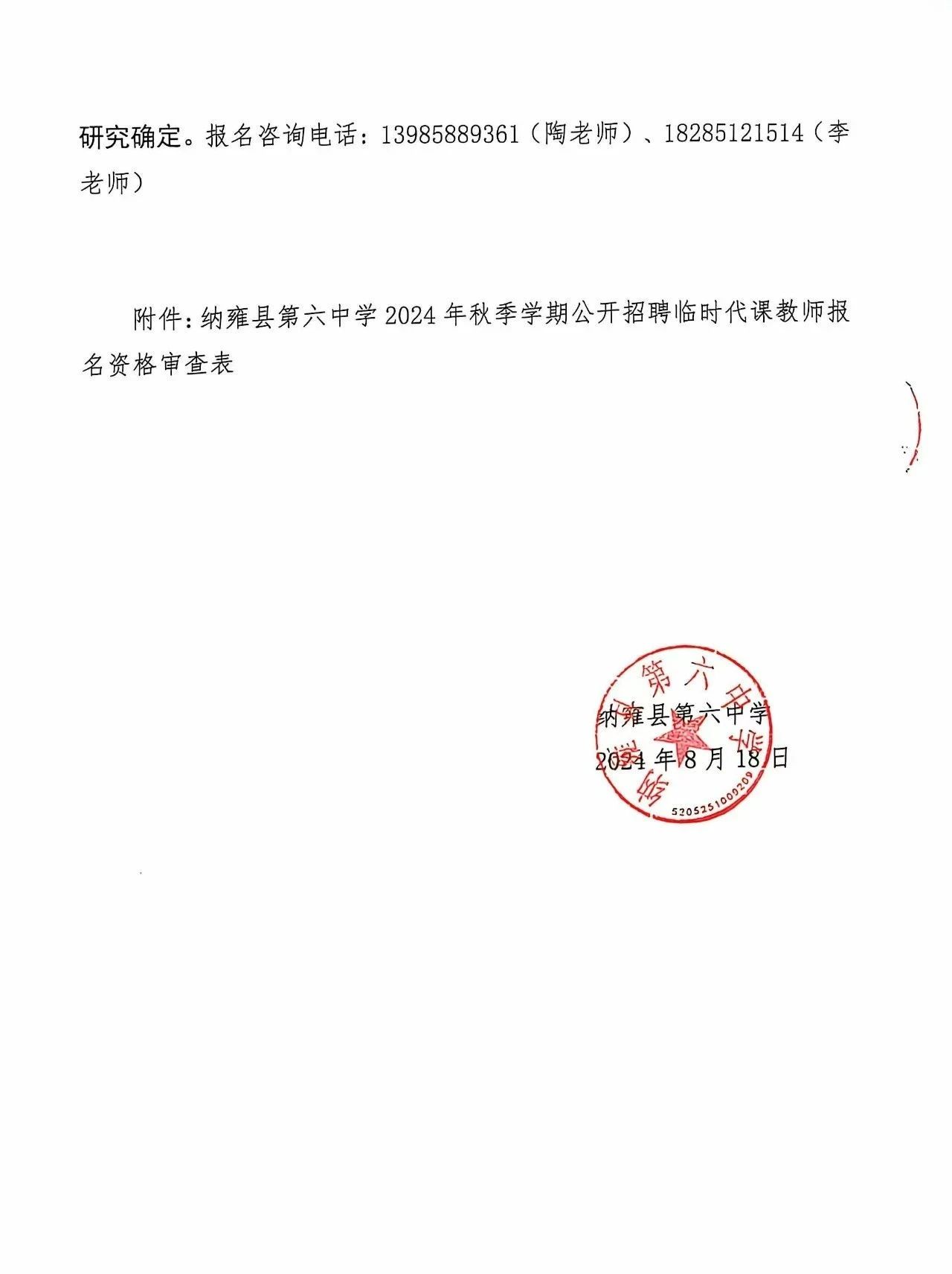 纳雍县第六中学2024年秋季学期招聘临时代课教师的公告(23名|8.18-8.22报名)