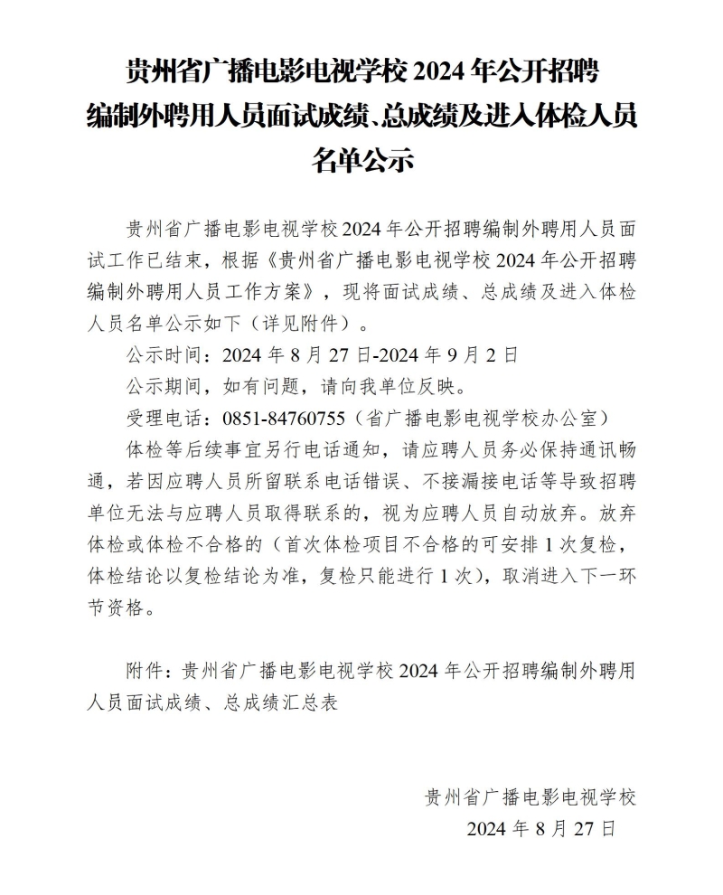 贵州省广播电影电视学校2024年公开招聘 编制外聘用人员面试成绩、总成绩及进入体检人员名单公示
