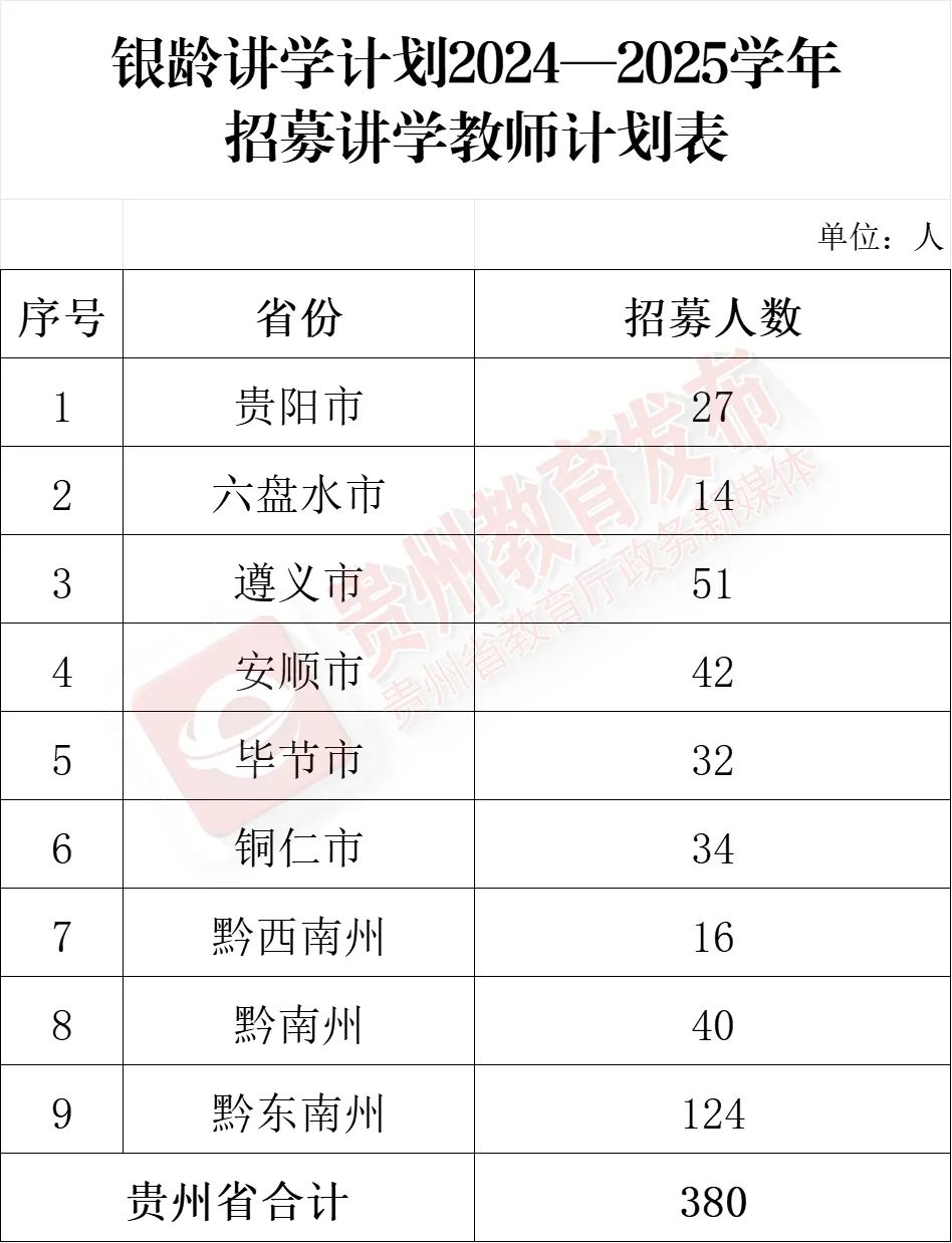 2024-2025学年全省银龄讲学计划讲学教师招募指标人数为380人,招募人员须为符合资格条件的退休教师。