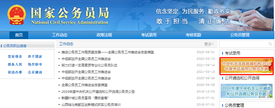 国家公务员考试报名方式主要采取网络报名的方式进行,报名网址为:国家公务员局(www.scs.gov.cn)报名入口开通后,本站也会及时更新。等2025年国考启动后,下图国家公务员局网站这里会更新成2025国考考录专题。点击进入即可进入报名登录页面。