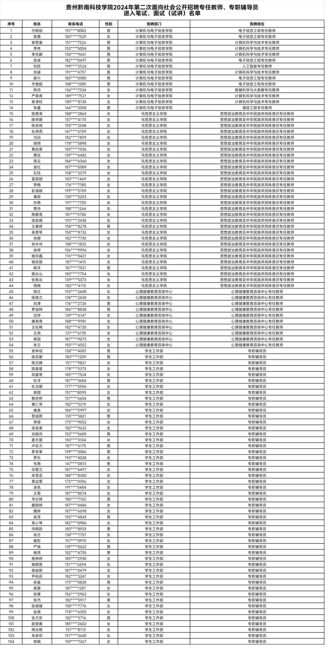 贵州黔南科技学院2024年第二次面向社会公开招聘专任教师、专职辅导员进入笔试、面试(试讲)名单 :