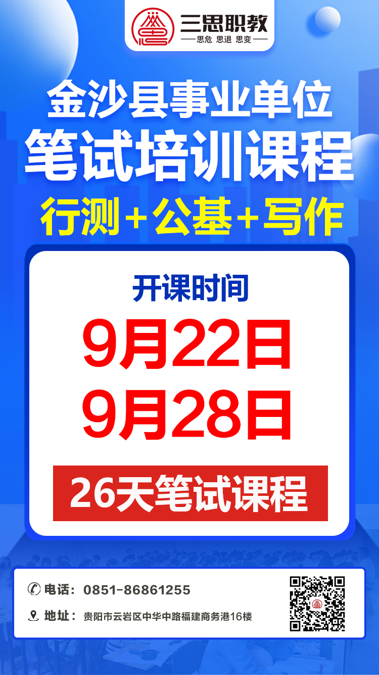 贵州三思职教2024年金沙县事业单位笔试培训班开课时间9月22日、9月28日,培训时长26天,主要针对金沙县第二批事业单位考试,笔试科目《公共基础知识》。事业单位笔试培训课程详情咨询13368515037.