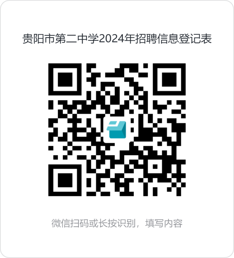 1.凡符合应聘条件者,请扫下方二维码如实填写《贵阳市第二中学2024年招聘信息登记表》,填写时请保证所提供的个人信息真实有效,若因提供虚假信息或隐瞒相关情况影响录用的,后果自行承担。