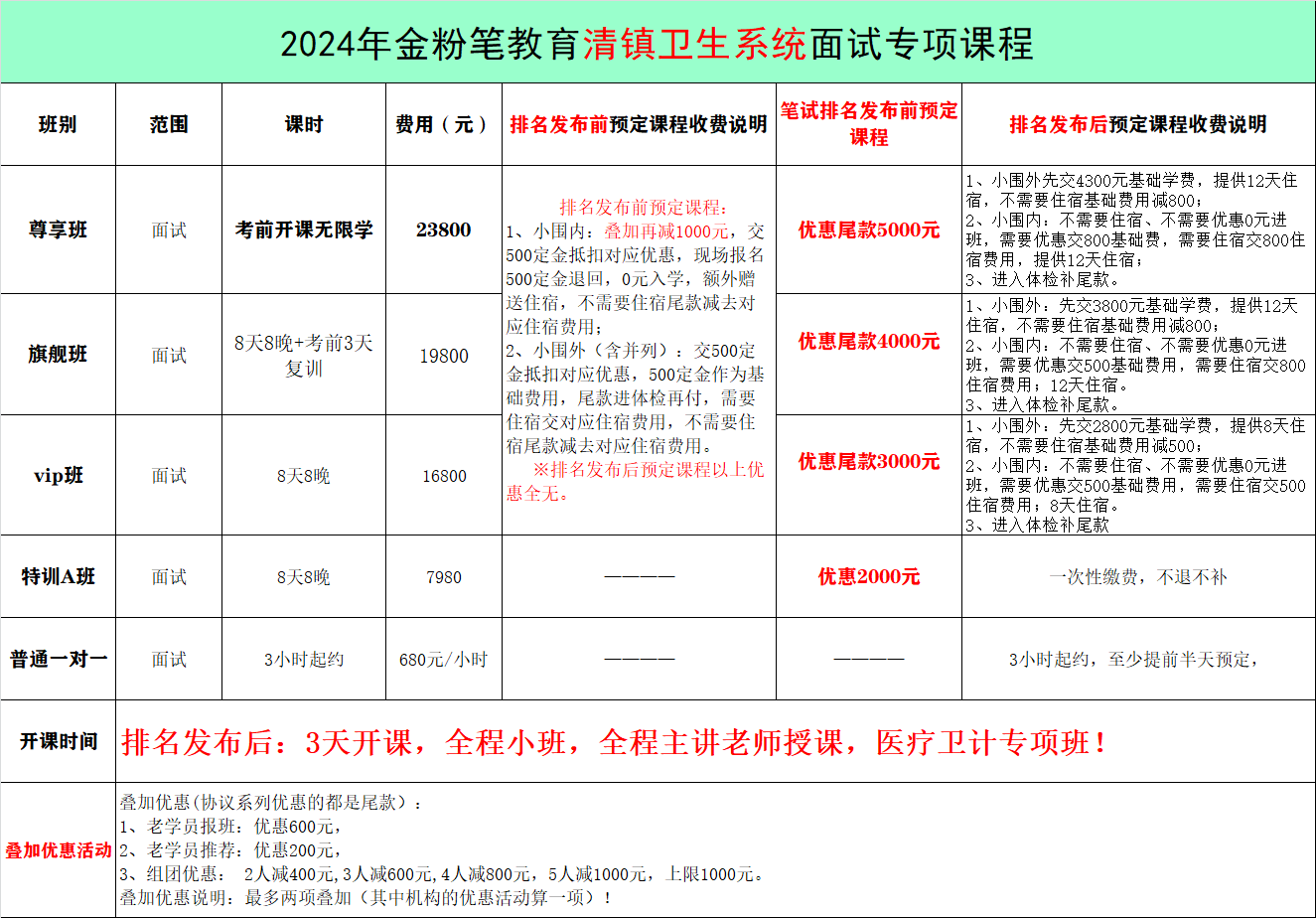 金粉笔教育.三思职教2024年清镇卫生岗面试培训班课程,清镇卫生系统,面试专项班,排名发布前预定课程0元进班,小围内叠加优惠1000包住宿,小围外交500定金,尾款上岸付。面试培训课程详情咨询及预订:13368515037(微同)。