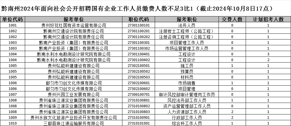 2、黔南州2024年面向社会公开招聘国有企业工作人员缴费人数不足3比1(截止2024年10月8日17点).xlsx