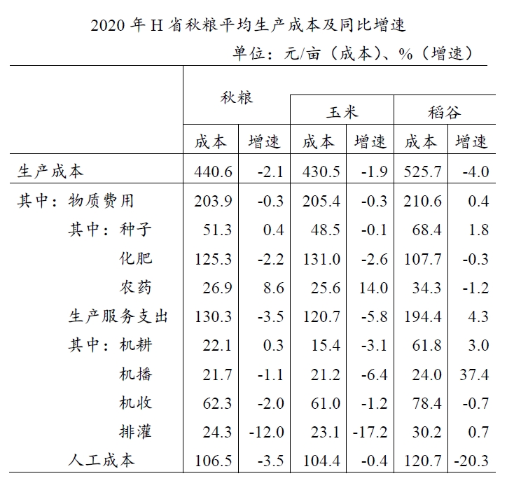 2020年,H省秋粮玉米和稻谷的市场平均交易价格分别为2.34元/公斤和2.74元/公斤,分别比上年上涨28.6%和8.7%。按此价格测算,2020年全省农户种植玉米、稻谷扣除成本前的产值分别为957.1元/亩、1520.7元/亩,分别比上年增长33.4%、8.9%。