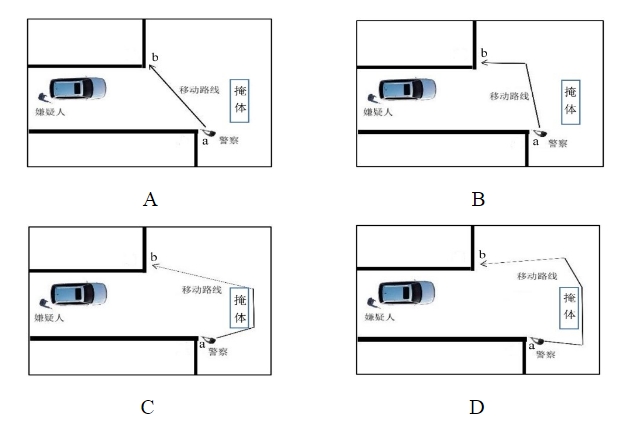 (4)如下图,小李与嫌疑人持枪对抗的过程中要从a点移动到b点,最佳的移动路线是:(单选)