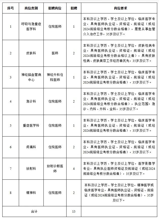 为加强医院人才队伍建设,根据学科发展需要,我院面向社会公开自主招聘编制外医务人员15名,现公告如下。